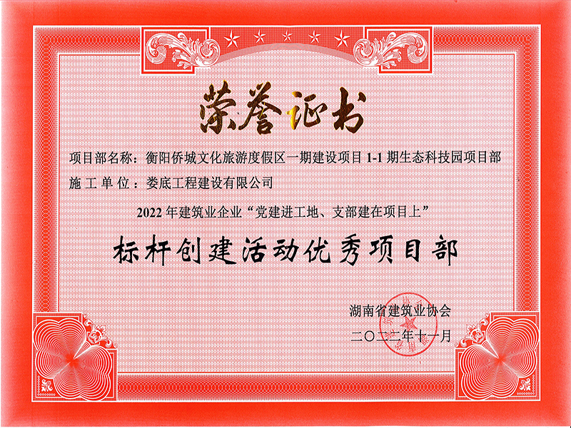 2022年衡陽僑城文化旅游度假區一期生態科技園項目標桿創建活動優秀項目部榮譽證書