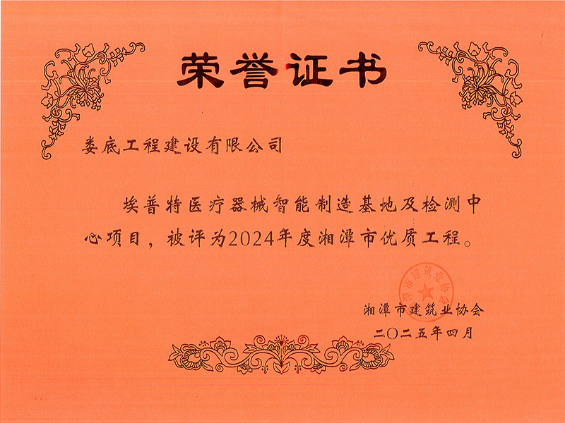 2024年度湘潭市優質工程榮譽證書(埃普特醫療器械智能制造基地及檢測中心)