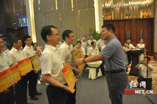 (湖南省住房和城鄉(xiāng)建設(shè)廳副廳長姚英杰為第一名張家界代表隊頒獎。)