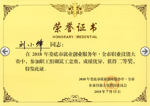 2018年7月13日,由婁底市人力資源和社會保障局、婁底市總工會、婁底市住房和城鄉(xiāng)建設(shè)局主辦的“2018年婁底市就業(yè)創(chuàng)業(yè)服務(wù)年.全市職業(yè)技能大賽”圓滿落幕。我公司選送的參賽選手劉小峰獲職工組砌筑工競賽二等獎,并被授予“婁底工匠”。
